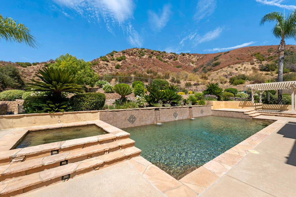 Nestled at the top of a cul-de-sac in the Silver Riviera tract, a long driveway leads to a flag lot affording extreme privacy with views of the foothills and across the valley to the mountains beyond. The Mediterranean style includes stucco finish and clay S-tile roof. The double door entry features multiple raised panel detail and upper leaded glass inset panes. The foyer is dramatic with a skylight over the curved staircase. The entry is finished in slightly distressed light wood floors. Step-down living room includes plentiful windows, high ceilings and a raised hearth fireplace. The formal dining is a quiet and elegant space with windows overlooking the pool and spa, and a swing door to the kitchen. The family room has a wet bar, wood floors, fireplace, and is open to the kitchen with direct access to the back yard. The kitchen is spacious and open to the breakfast nook and family room. This space has windows that overlook the yard and pool, and take full advantage of the views to the foothills. The spacious primary bedroom is accessed through double doors at the top of the elegant curved staircase and includes a fireplace and balcony. The hallway leading to the ensuite bathroom has a mirrored wardrobe on one side and a large mirrored walk-in closet on the other. The light filled bathroom has a tiled L-shaped counters with two sinks on one side, and a makeup vanity on the other. Cornered jetted tub, steam shower, and private water closet. There are four secondary en-suite bedrooms, one downstairs and the other three privately situated upstairs. The back yard terraces up to the hillside with a meandering pathway and down the hillside to a rose garden, fruit trees, and a vegetable gardening area. This area also features two Tough Sheds for storage. The pebble-tec finished pool is elegant and rectangular with an elevated spa with a waterfall spillover in to the pool. The flagstone that surrounds the pool and accents the concrete patios is a sandy soft pink hue. There is a trellised dining pavilion near the BBQ center, and an additional trellis covered patio on the side yard that takes advantage of the views across the valley.This unique location is in an historic area of Agoura known as Cornell. Cornell is a unique, picturesque neighborhood of homes along the scenic Mulholland Highway Corridor and in the rural mountain area near Malibou Lake. It is largely surrounded by open space parks within the NPS Santa Monica Mountains National Recreation Area, including Paramount Ranch and Peter Strauss Ranch parks. Cornell is notable for its 'tall trees' atmosphere among old-growth oak and pine, and for the many peacocks that roam the neighborhoods, and perch on residents' rooftops and balconies. With direct access via Kanan Road to Malibu, this area a short drive to Point Dume and other Malibu beaches.