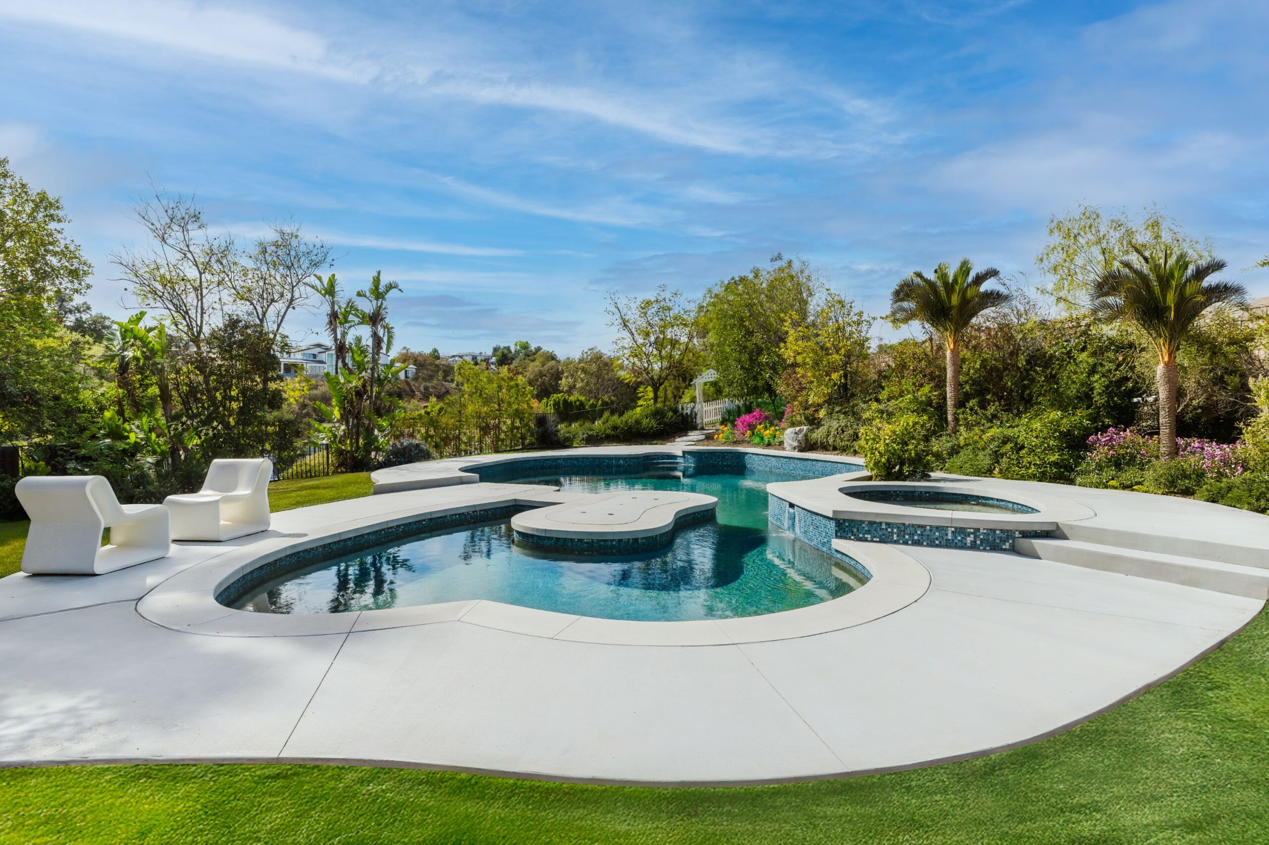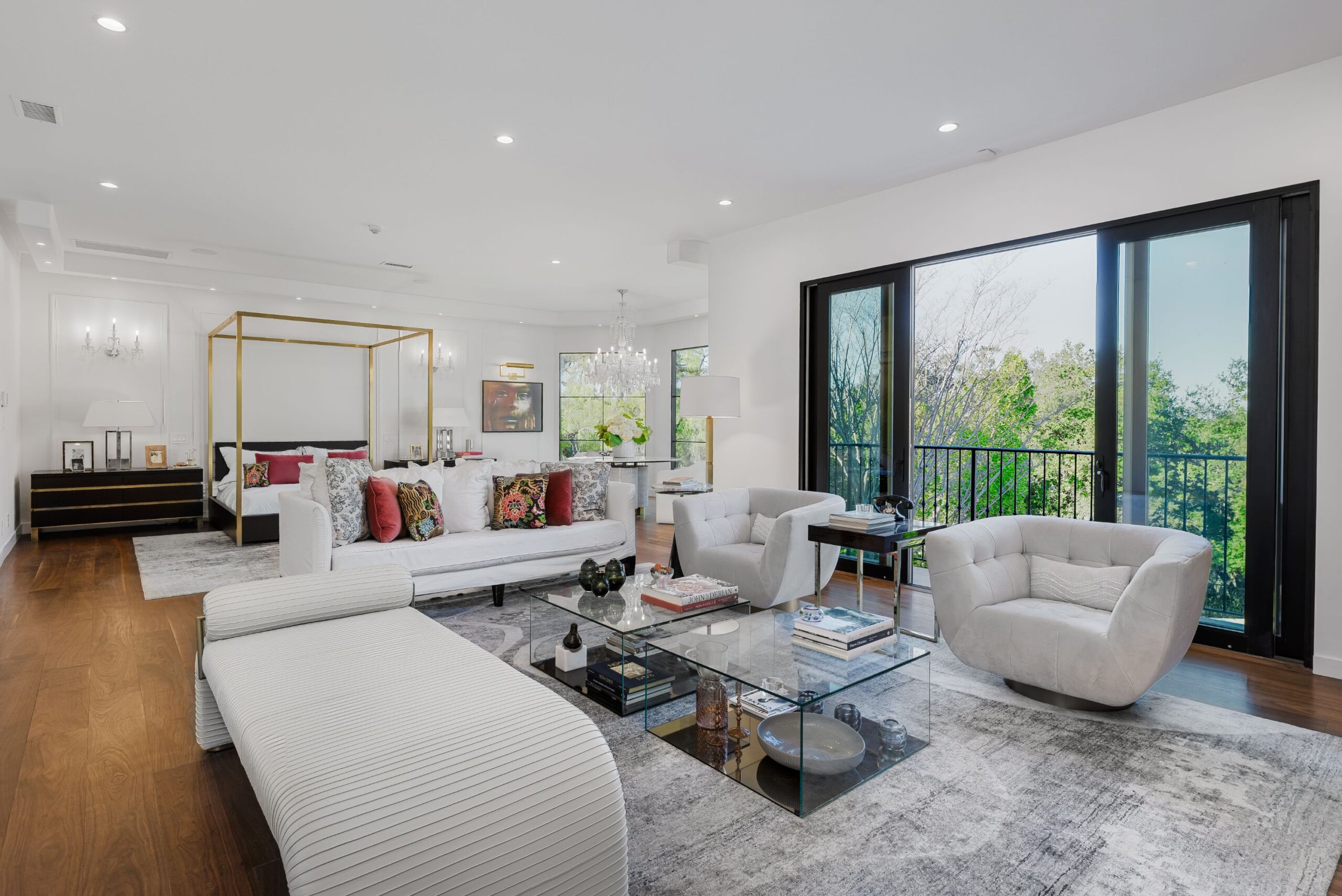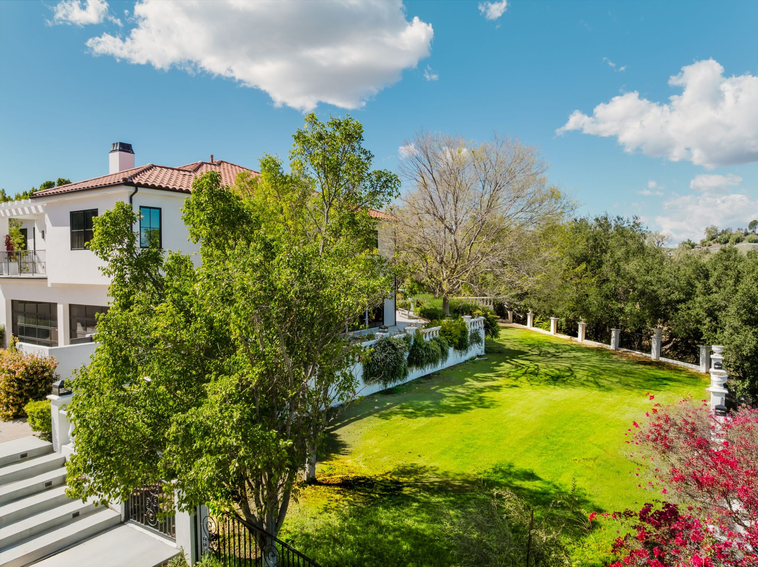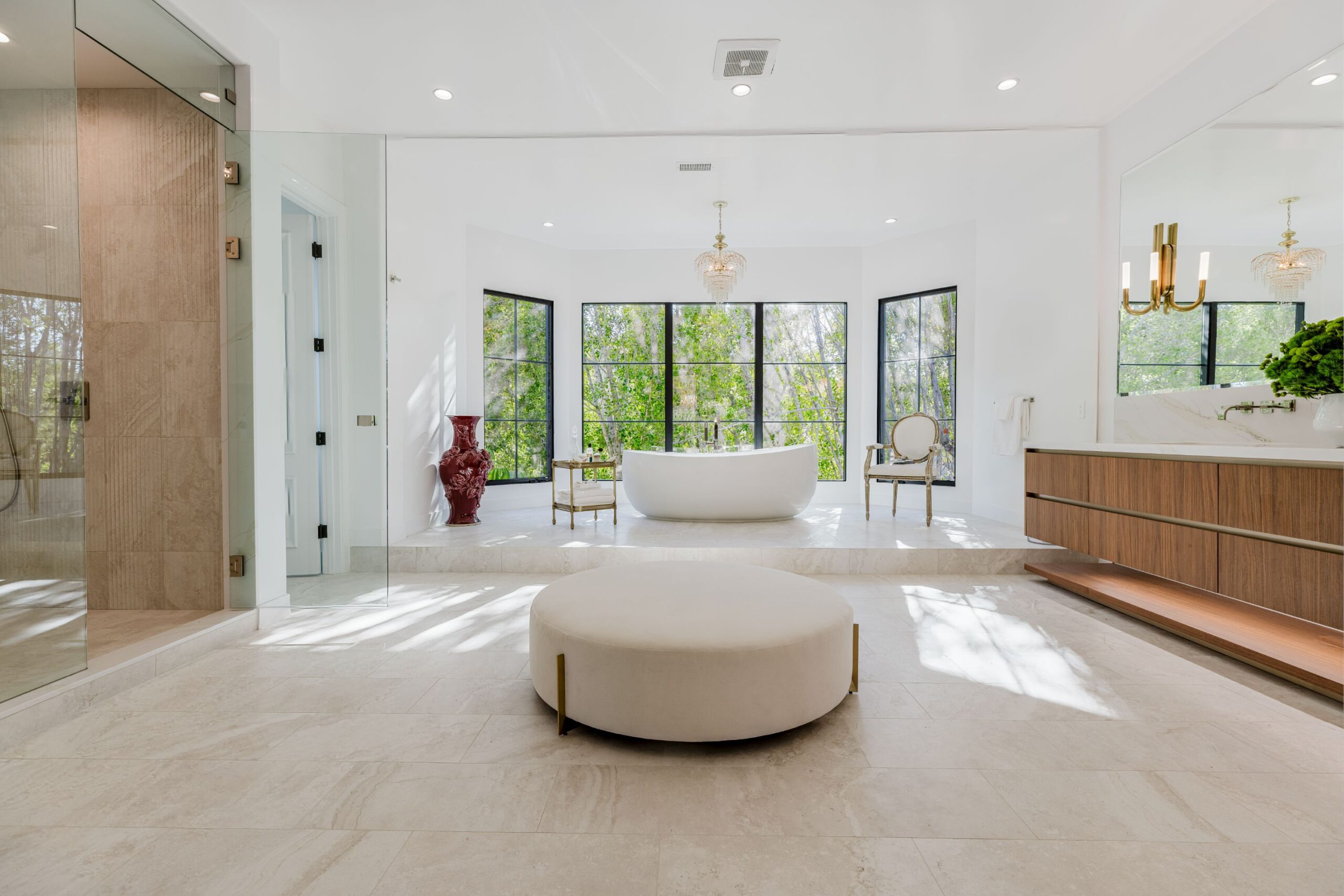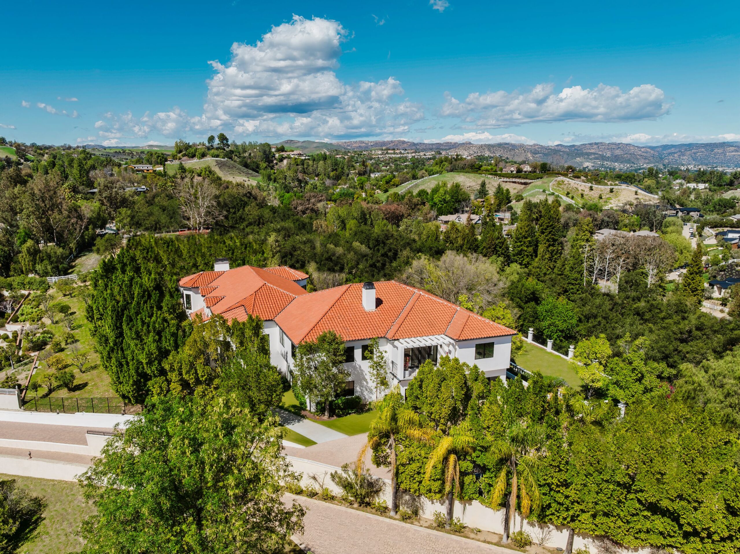 Located in the prestigious, gated community of Hidden Hills West, this fully remodeled estate spans 2.58 acres and offers a rare blend of privacy, luxury, and modern living. With 6 bedrooms, 6 bathrooms, and 11,120 square feet of living space, this home is designed to impress at every turn. As you approach, a long gated private driveway leads to a massive motor court, setting the stage for a grand entry. The oversized wooden pivot door opens to a dramatic foyer with a sweeping spiral staircase, inviting you into the heart of the home. Expansive glass doors throughout allow natural light to flood the interior, creating a seamless connection between the indoors and the surrounding landscape. The chef's kitchen is a showstopper, with an oversized marble island featuring waterfall edges crafted from just two large pieces of book matched marble. The kitchen's chevron parquet wood floors flow effortlessly into the formal dining room, where pendant ring-shaped lighting adds an elegant touch. Top-of-the-line Miele appliances and Sub-Zero refrigerators make this space perfect for both everyday living and entertaining. The family room, with its soaring double-height ceilings and oversized windows, is flooded with light. For those who enjoy wine, a beautifully designed wine storage area and bar offer an elegant spot for entertaining guests. Upstairs, the expansive primary suite offers a luxurious retreat. The suite features two sitting area with a dual-sided fireplace, a private balcony with sweeping views of the lush backyard, and elegant chandeliers that enhance the room's sophisticated ambiance. The oversized primary bathroom includes a walk-in shower and steam room, along with a brand-new infrared sauna. The walk-in closet is a standout, with a massive center island for accessories and ample space for storage, including a dedicated area for shoes. A spacious junior primary suite provides a private living room and an en-suite bathroom, offering additional privacy and comfort. The upstairs office is designed to evoke the elegance of a Soho House, complete with a marble fireplace and a grand chandelier wrapped in gold leaf perfect for work or relaxation. The lower level of the home features a guest bedroom with an en-suite bathroom, a butler's kitchen, and a large living room with direct access to a piano entertainment room. Expansive glass doors lead out to the backyard, where the possibilities are endless for outdoor living and entertaining.The estate features a sprawling backyard with a custom pool and beautifully landscaped gardens, creating the perfect setting for outdoor relaxation and entertainment. Gated with secure code entry, this home ensures both privacy and peace of mind. It's a rare opportunity to experience luxurious living at its finest.