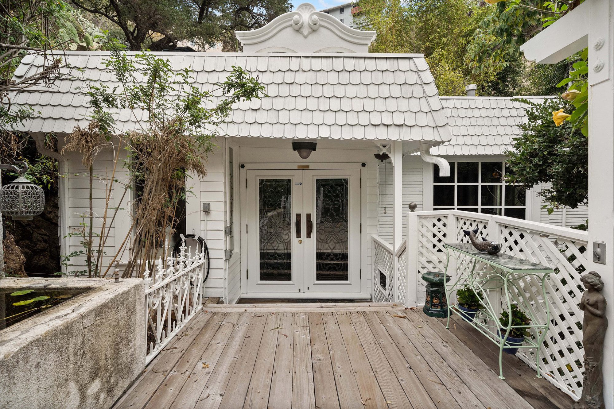 Set on 5-parcels of land high in the Hollywood Hills, this remarkable residence is a showcase of innovative design and eye-catching retro flourishes. Taking full advantage of the surrounding natural beauty, it offers you treetop views, winding outdoor steps and pathways, as well as multiple alcoves for enjoying the serenity of nature. Whether you're seeking a full-time residence or a bachelor hideaway, this is a truly unique abode you can be proud to call your own. Inside, the living room invites your guests to enjoy the warmth of an old-fashioned wood-burning stove under a beamed wood ceiling. Descend a spiral staircase to the dining room below where you'll also find another informal seating spot and access to the home's expansive wrap-around deck. Have a seat at the kitchen's breakfast bar overlooking an amazing vintage stove that your home chef is going to love. From the hardwood flooring throughout to the stonework and terracing outside, this storybook home has attractive features at every turn.