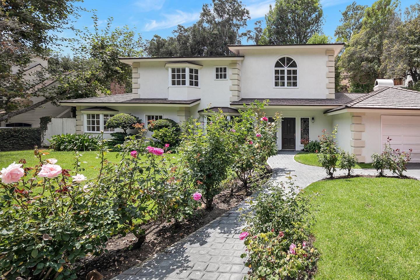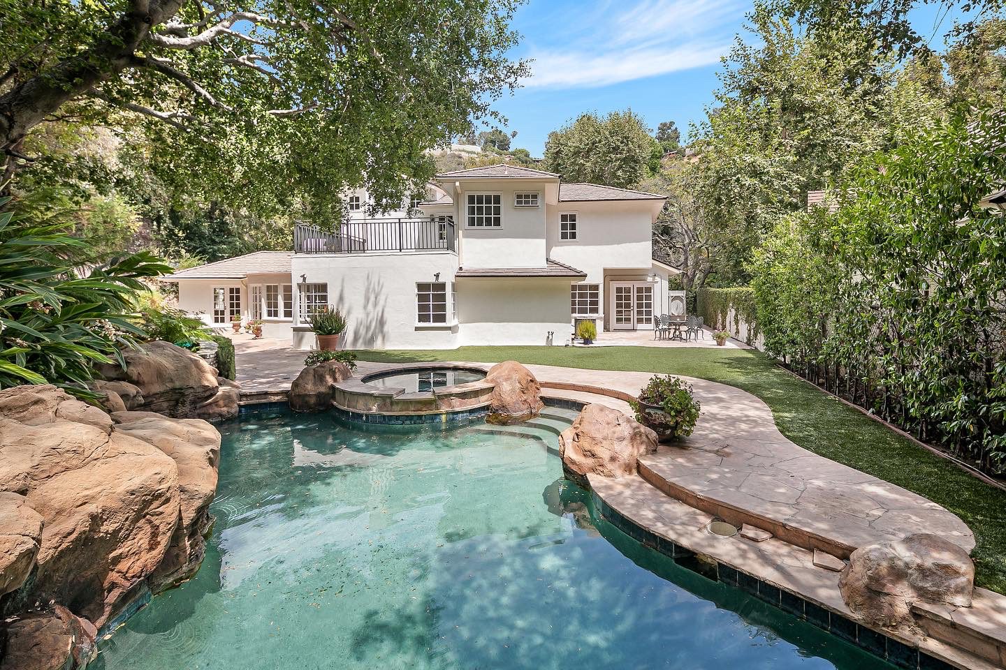 Stunning traditional family home in lower Bel-Air sits on the coveted tree-lined, quiet street of Moraga Drive. This rare, 5-bedroom, 5.5-bathroom property showcases exquisite details throughout the 4,135sf. With rich, hand textured wide plank Brazilian cherry hardwood flooring in its entirety, beautiful windows that bring in bright, natural light and soaring ceilings, the home radiates sophistication and class. The main level hosts a fabulous dining room with direct access to the white, bespoke kitchen that features a stone-topped island, top-of-the-line appliances and cozy eat-in area with breakfast bar. Complete with the desired, indoor/outdoor living, all family and common rooms have direct access via French doors to the incredible backyard. Consisting of multiple outdoor dining/living spaces, a pool with waterslide, spa, fireplace, romantic terrace with views, and lush greenery. Accompanying the main level is a junior suite, two additional en-suite bedrooms, and a bonus room that can be transformed into a bar, office, etc. Up the dramatic front staircase, the spacious primary suite welcomes you with a his/her walk-in closets, spa-like bathroom with dual vanities, soaking tub and features an amazing oversized private terrace with breathtaking views overlooking the grounds. Ideal for all entertaining and hosting, this property has it all! Warner Ave. or Roscomare school districts.