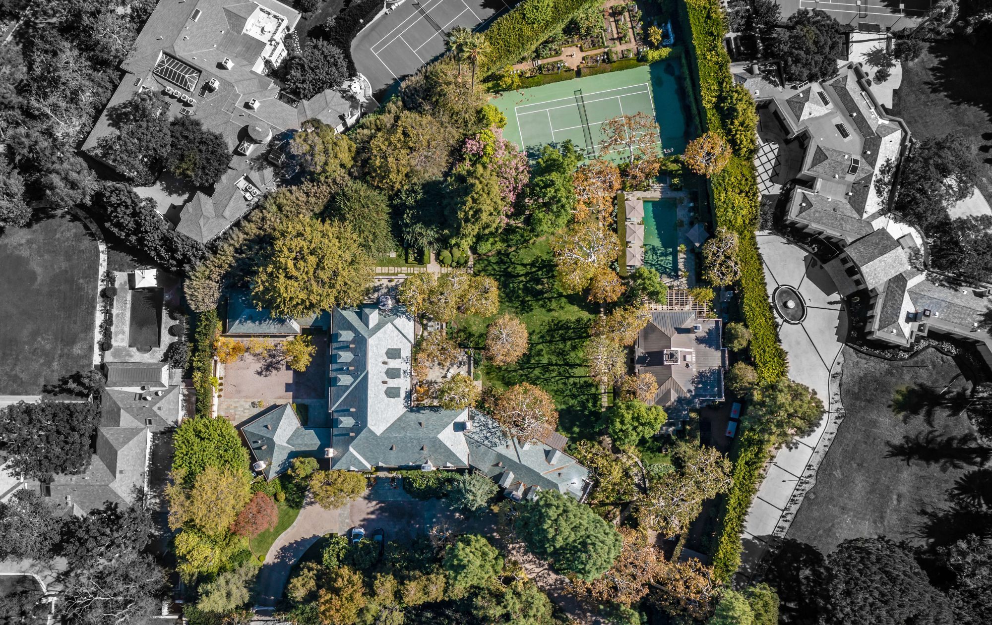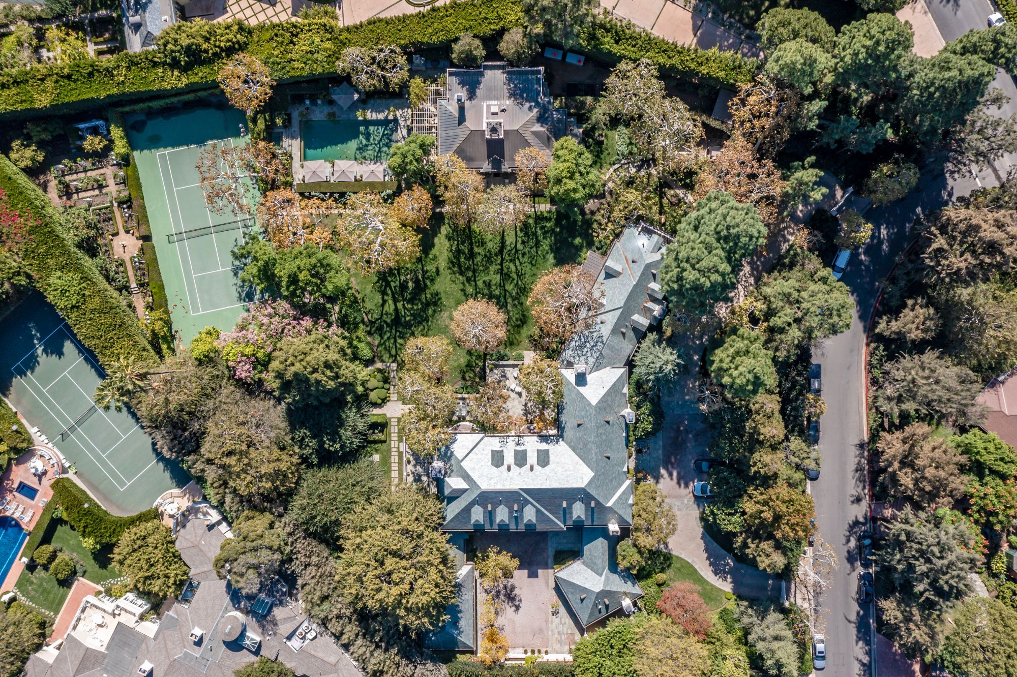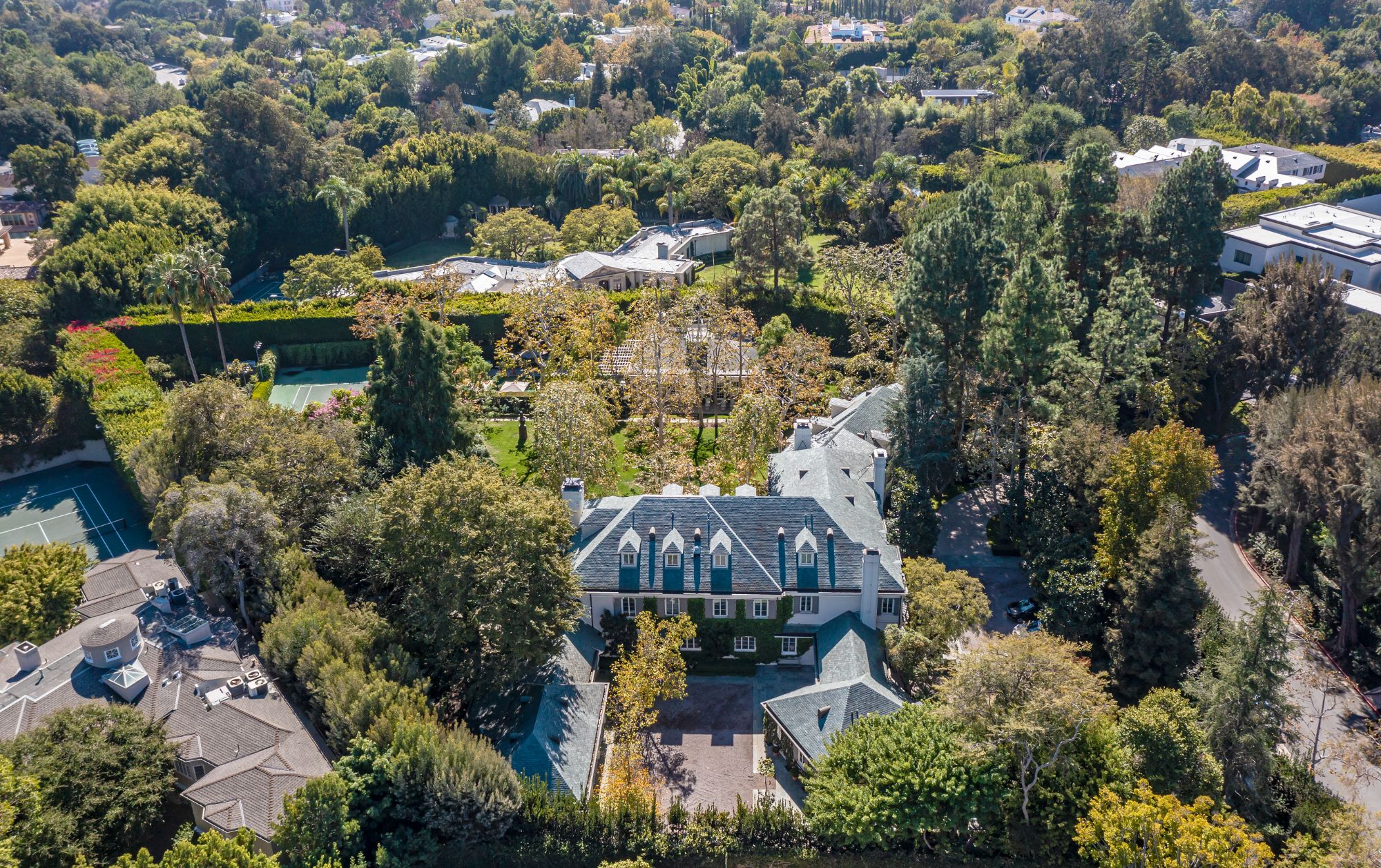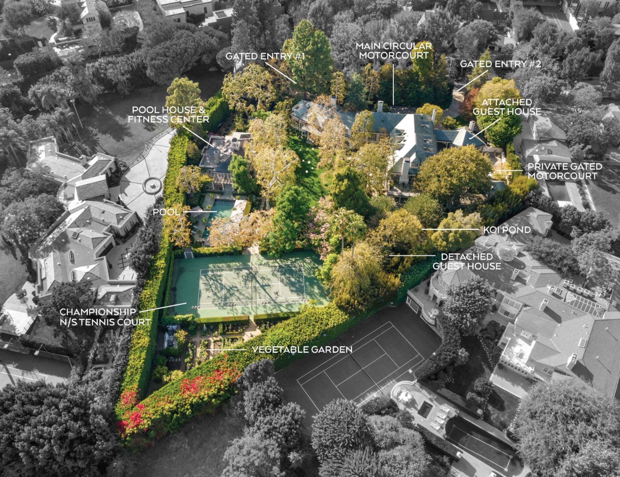 Nestled on 2 acres in Holmby Hills, The Faring Estate by renowned architect Oscar Shamamian stands as a legendary monument to Los Angeles history. Two gates lead to this European-inspired compound with a circular motor court and a secondary gated court/garage (15+ cars). Enter the main house to a stunning 2-story entry with spiral staircase, bright formal living and wood-paneled great room with office, bar & outdoor deck. Endless amenities featuring wine cellar, cozy breakfast room, 3rd-floor playroom and chef’s kitchen with butler’s pantry. Primary suite with dual closets/bathrooms, private sitting room & salon and 3 additional bedrooms with en suite baths. Sprawled on a lush flat lawn, show-stopping grounds with outdoor decks, saltwater pool, koi pond, vegetable/rose gardens, championship N/S tennis court and pool house with sauna & fitness center. Two fully-equipped guest houses; one an original piece by iconic architect John Elgin Woolf. Every convenience at your reach, entertain with ease and become a part of true L.A. history.